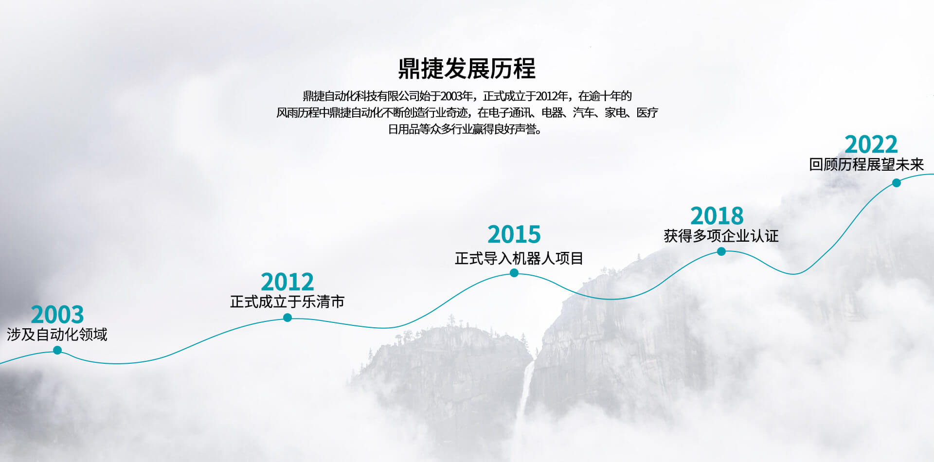公司始于2012年,在逾十年的風(fēng)雨歷程中,不斷創(chuàng)造行業(yè)奇跡,在電子通訊、電器、汽車、家電、醫(yī)療、日用品等眾多行業(yè)贏得良好聲譽(yù)。公司坐落于浙江省樂清經(jīng)濟(jì)開發(fā)區(qū),現(xiàn)有人員63人,擁有經(jīng)驗(yàn)豐富的工程技術(shù)研發(fā)團(tuán)隊11人,其中高級工程6人,具備本科以上學(xué)歷高級工程人員比例78%;同時鼎捷自動化在蘇州,東莞等地設(shè)立分公司以服務(wù)目標(biāo)市場客戶,目前鼎捷自動化已經(jīng)為下客戶提供配套自動化解決方案:泰科、安費(fèi)諾、莫士、華為、中興、普聯(lián)、智英、意華、德豐、公牛、萬事達(dá)、華豐、飛雕、普思、冠聯(lián)、俊朗松田、進(jìn)聯(lián)、高正、盛凌等。鼎捷自動化專業(yè)從事連接器、開關(guān)及相關(guān)電子、電器、五金、塑膠產(chǎn)品組裝自動化定制、設(shè)計、制造、銷售。2012年,鼎捷自動化正式導(dǎo)入機(jī)器人應(yīng)用項(xiàng)目,可為各類客戶提供電子、電器、汽車、五金、塑膠等集成自動化智能組裝系統(tǒng)。